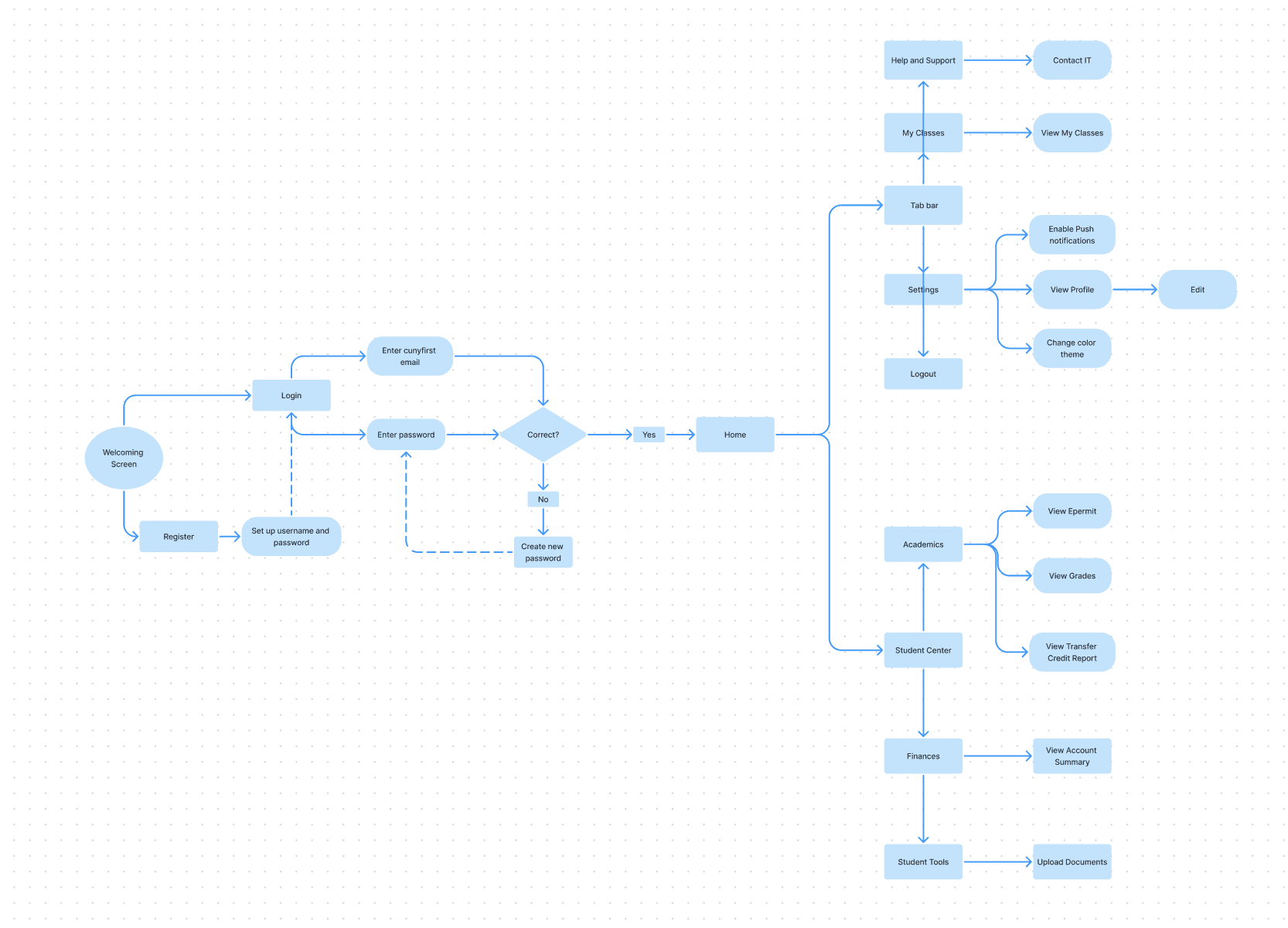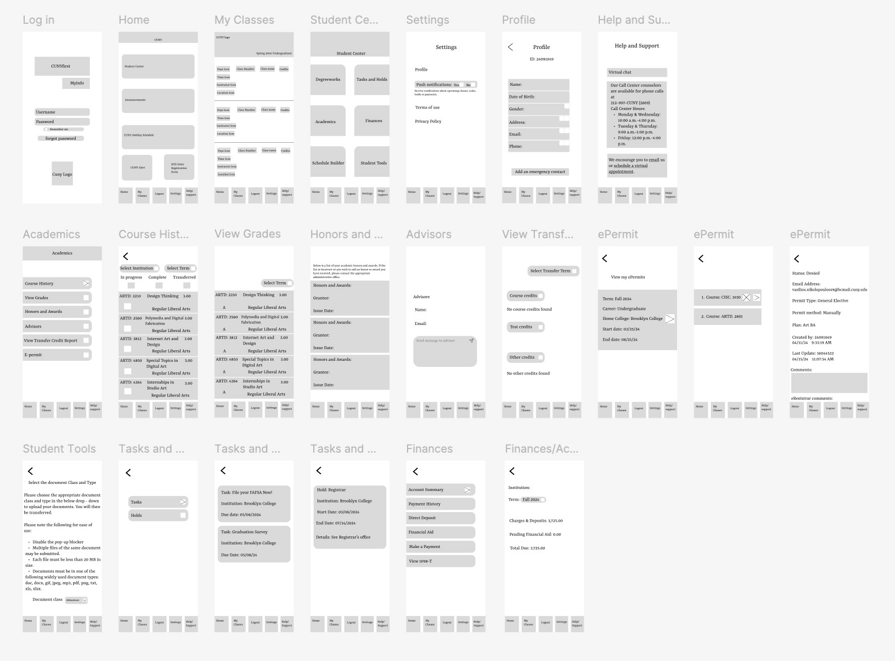 I would definitely say that I got in-depth with Figma and figured the usefulness of interactive elements. For example, the navigation bar which switches to a yellow color background once a user taps on one of the 5 buttons. However, figuring out the UI was very challenging because Cunyfirst’s platform is desktop-based so I had to come up with something completely different for a mobile version. I wasn’t sure if I should’ve included the build your schedule feature along with the upload your documents under “Student Tools” as desktop use is more convenient in such cases.