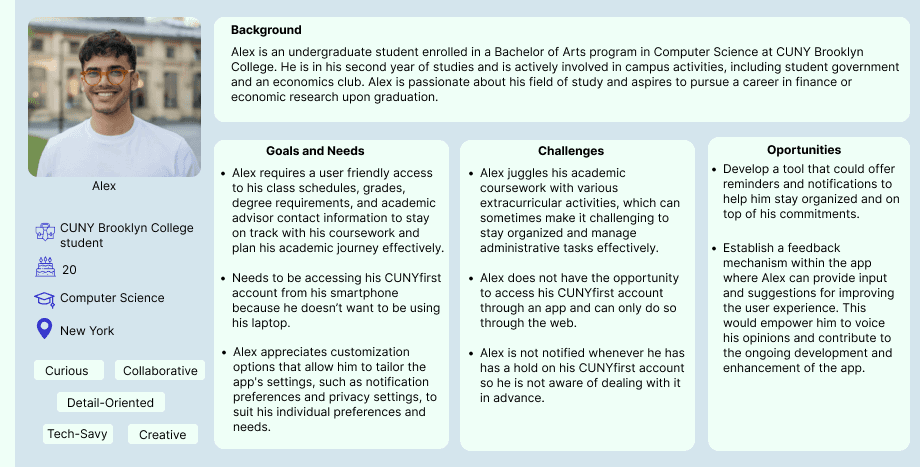 I initially created a persona so I could determine the needs, challenges and goals of a common student. After that, I gathered quantitative data by conducting interviews with three CUNY students.